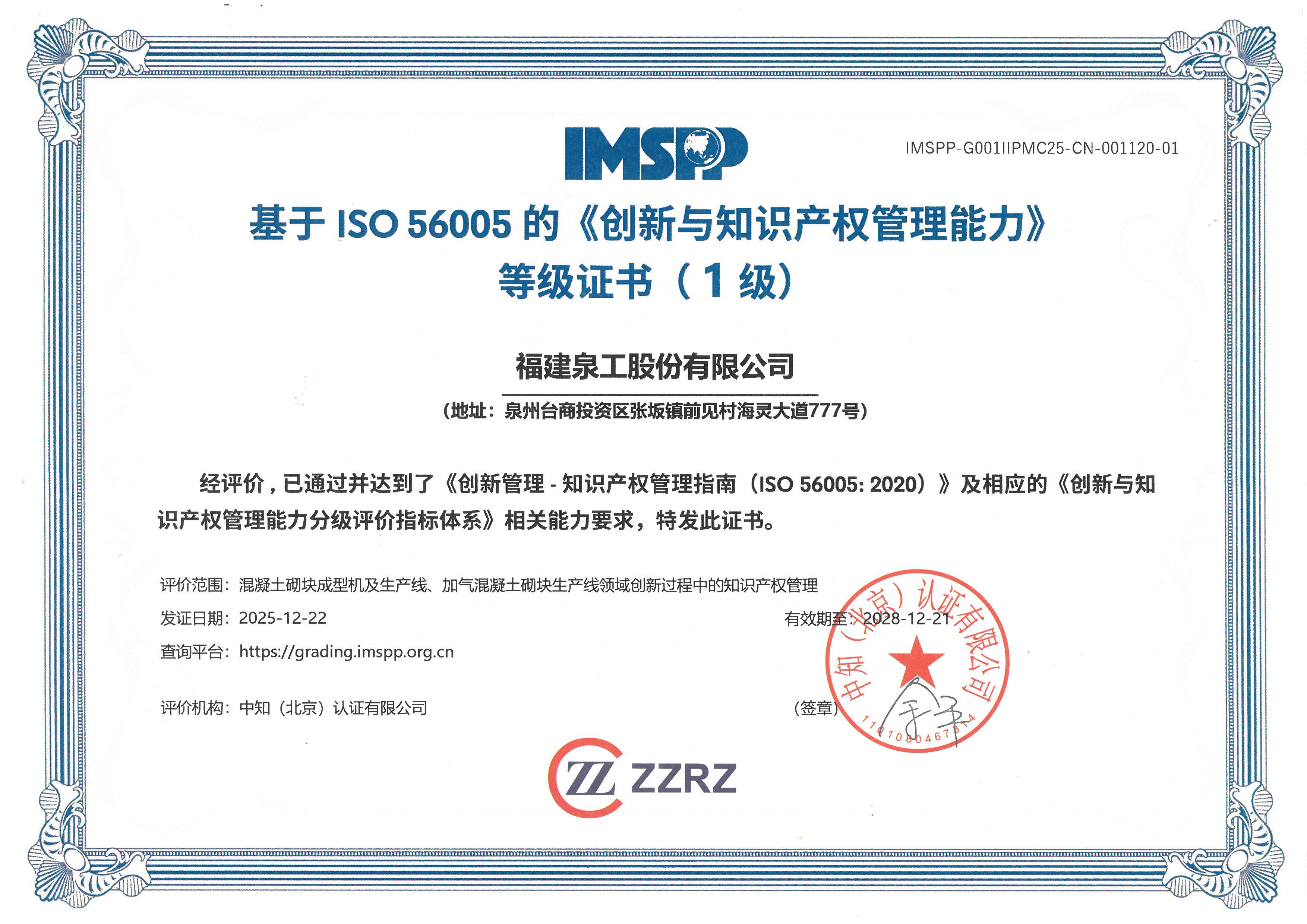 此次获得ISO 56005等级(1级)证书,标志着泉工股份在创新与知识产权管理方面迈出了重要步伐。泉工股份将继续致力于推动企业创新能力的提升,进一步优化技术研发与知识产权保护,为全球市场提供更加高效、绿色、智能的建材装备与服务。